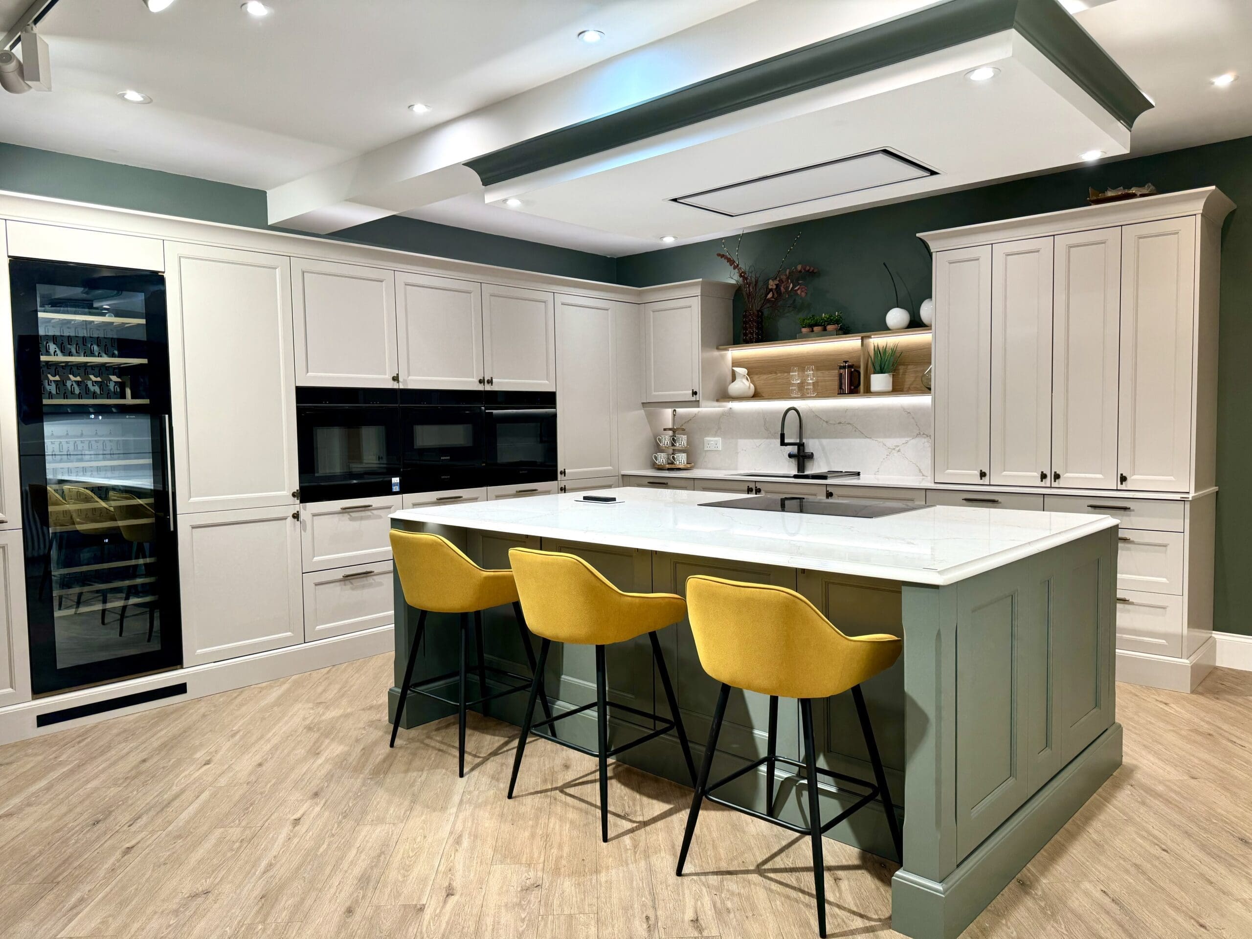 This gorgeous kitchen looks much more expensive that it is with a sophisticated colour combination of on- trend Botanical Green and soft Cashmere. With all the quality you would expect from British Brand Omega, this Charles Rennie Mackintosh design incorporates everything you could wish for in your dream kitchen; from the pantry cupboard to the stunning island. There are also some clever final additions such as skirting plinth, which lifts the design.